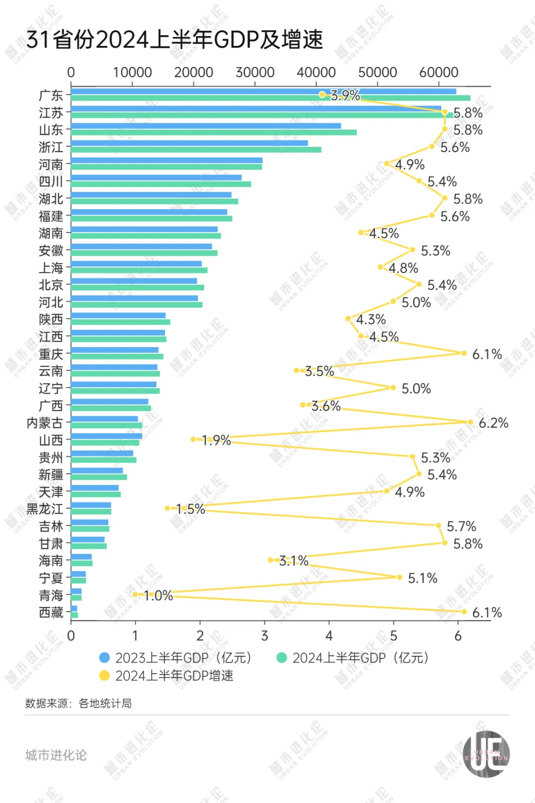 其中,又以粤苏之争最具代表性,这两省也是上半年唯二站上6万亿级体量的省份。