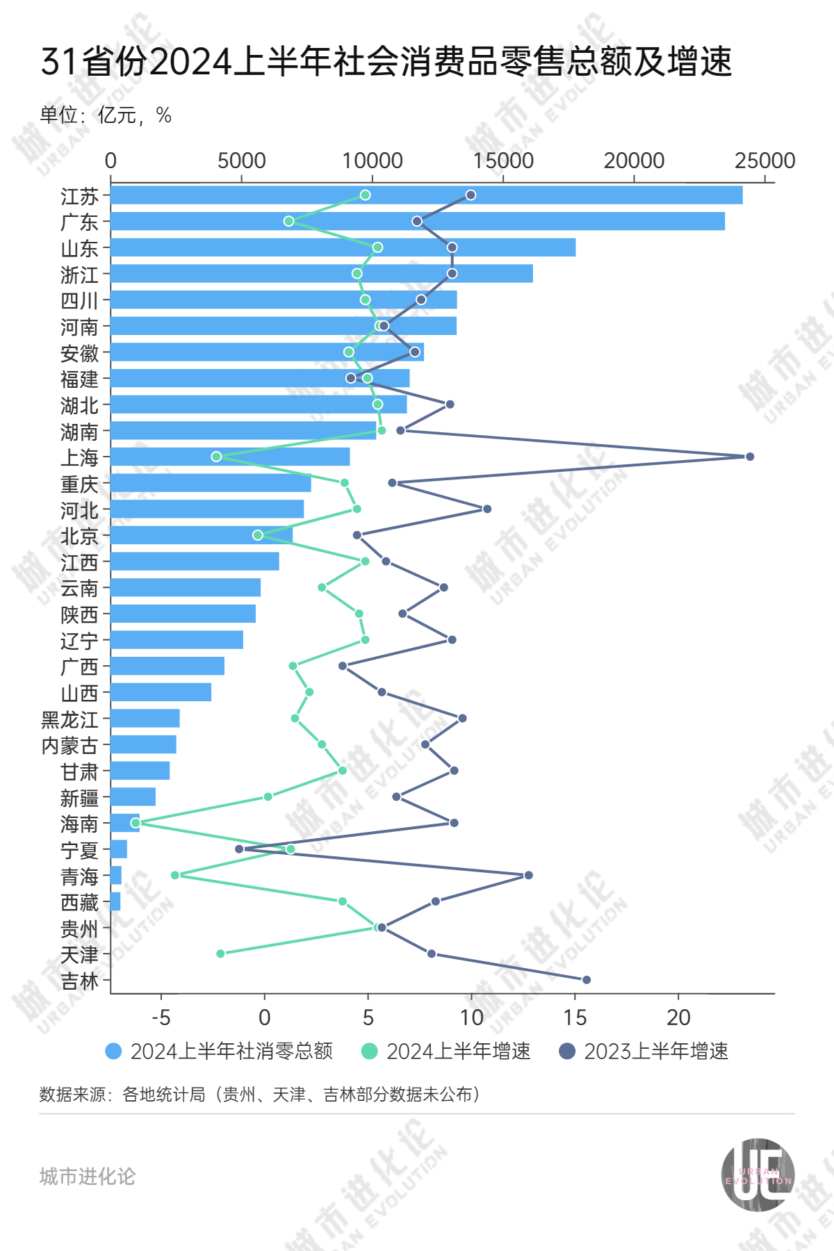 值得注意的是,31个省份的经济半年报中,北京、上海、天津、海南、青海都出现了社会消费品零售总额同比负增长的情况,降幅分别为0.3%、2.3%、2.1%、6.2%、4.3%。