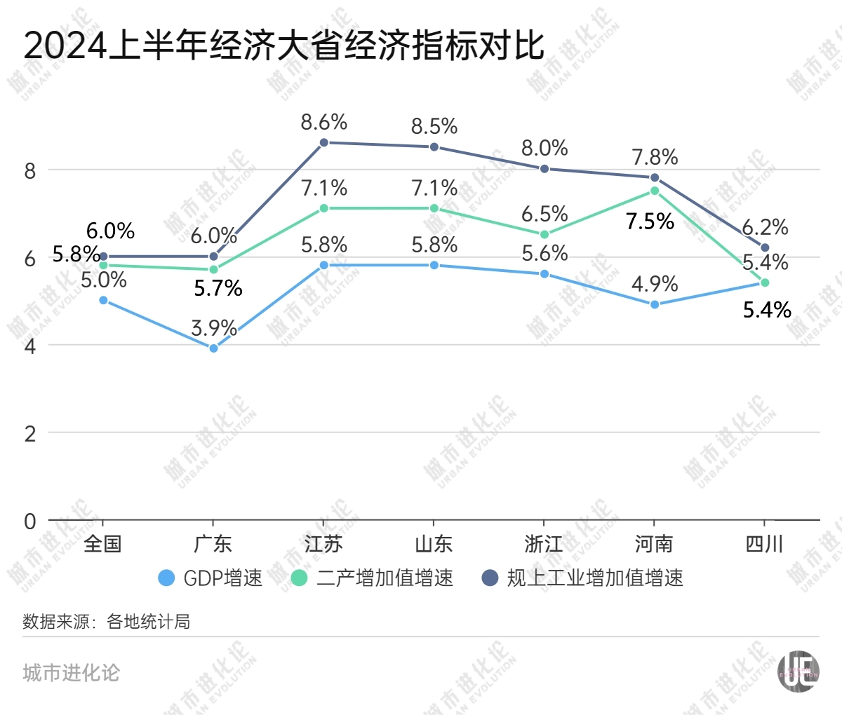 从今年上半年的经济表现看,江苏、浙江、山东、四川高歌猛进,广东、河南则跑输大盘。